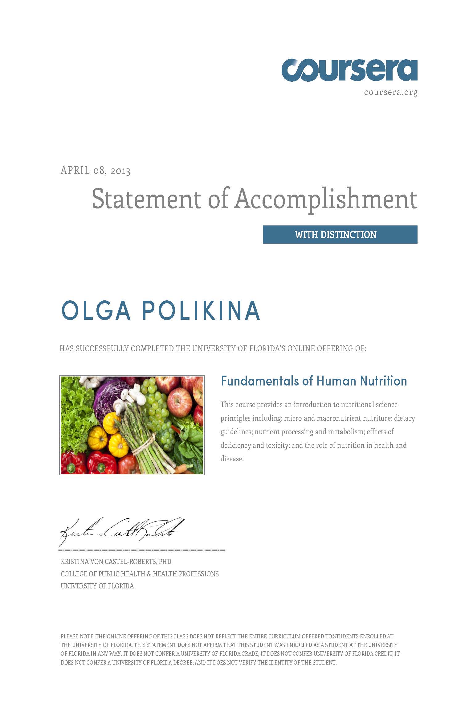 Оля живет сейчас на два города, и почти весь прошлый год она провела в Вене, где родила сына Максимилиана. При этом она продолжала повышать свою квалификацию. В 2013-м Оля окончила три специальных курса по питанию. ChildNutritionandCooking 2.0 Стэнфордского университета, где изучила особенности питания детей раннего возраста с учетом потребности во всех необходимых питательных веществах, и где особое внимание уделялось формированию привычек здорового питания и вовлечению детей в кулинарный процесс. Курс Калифорнийского университета NutritionforHealthPromotionandDiseasePrevention, который рассматривает базовые принципы диетологии с точки зрения доказательной медицины как для здоровых людей, так и для пациентов с целым рядом заболеваний. Что особенно актуально, на этом курсе разбираются практические аспекты разработки диетологических программ с учетом индивидуальных особенностей человека. И наконец, курс университета Флориды FundamentalsofHumanNutrition, название которого говорит само за себя. Так что участников «Вкуса легкости», который стартует 25 января, ждут не только впечатляющие результаты, но и много полезных знаний и навыков, которые легко можно использовать не только для себя, но и для всей семьи!